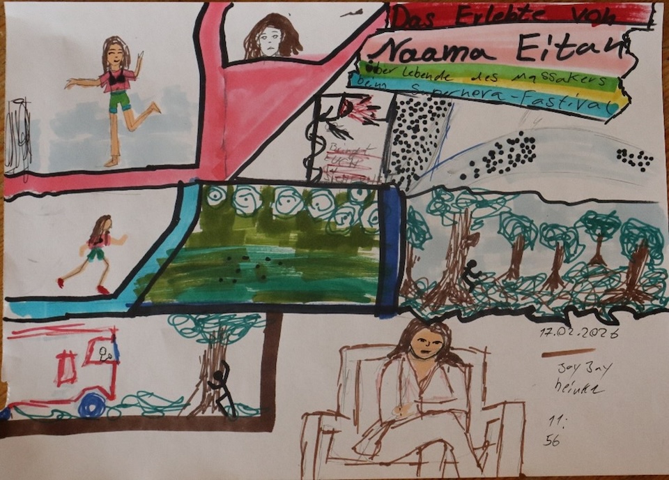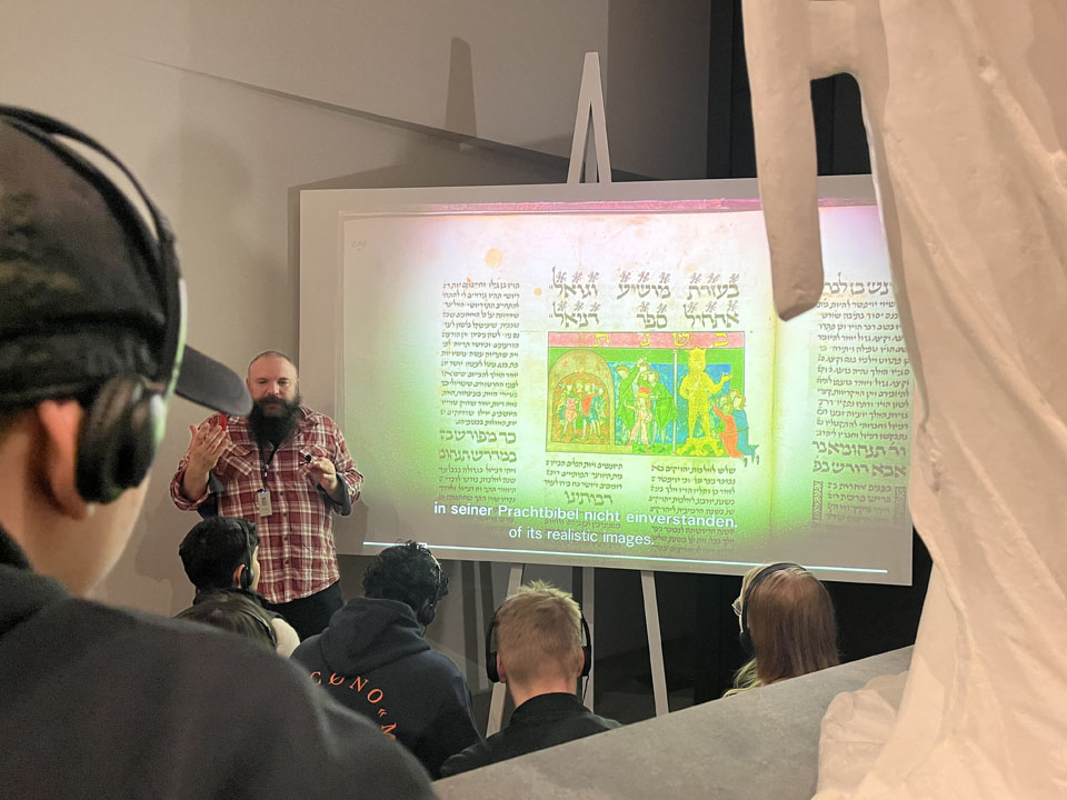 Dann sind wir in die Ausstellung gegangen und haben uns mit einer großen Schriftrolle beschäftigt, der Tora. Sie wurde von einer jüdischen Familie gespendet. Nebenan war ein Videoraum, dort haben wir ein hebräisches Lied angehört. Und wir haben unsere Namen auf Hebräisch geschrieben. Der Guide hat dann unsere Namen gelesen auf Hebräisch.
